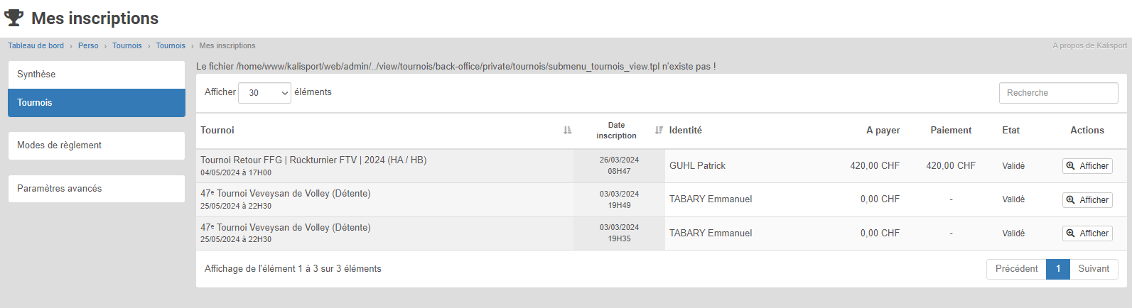 La page Mes Inscriptions (tournoi) devrait, selon moi, permettre lister soit