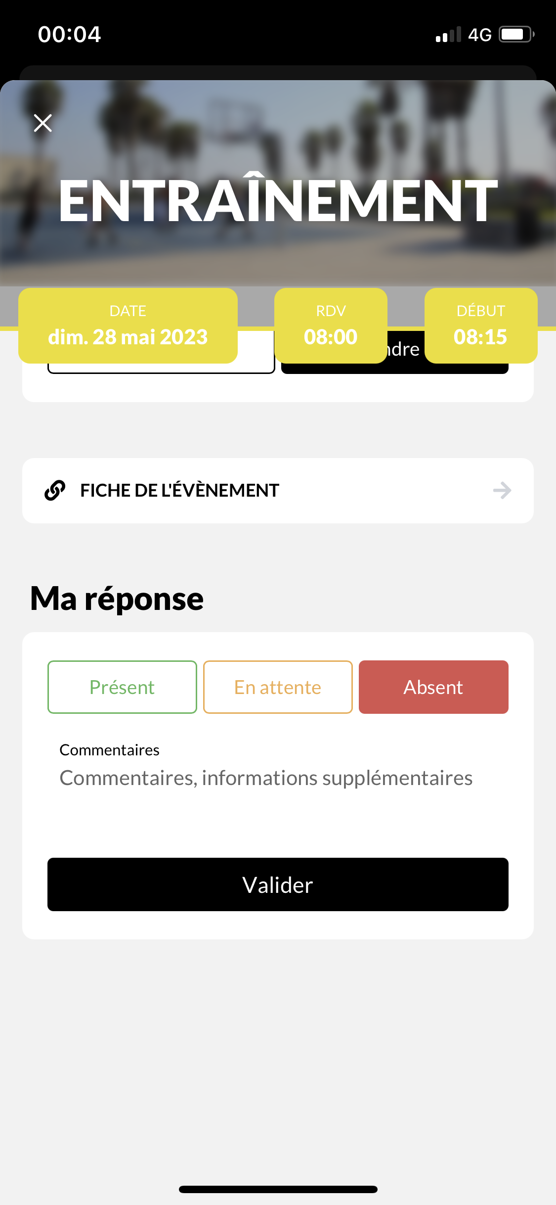 Lorsque l’on arrive sur un événement (ex : un entraînement ) et que l’on souhaite valider sa présence : on clique sur le statut (ex : présent), la case passe en sur-brillance puis on clique sur « valider » et là le curseur passe dans la case commentaire. Il faut alors recliquer sur le bouton valider. Cette étape intermédiaire de commentaire semble trop longue et peu nécessaire.