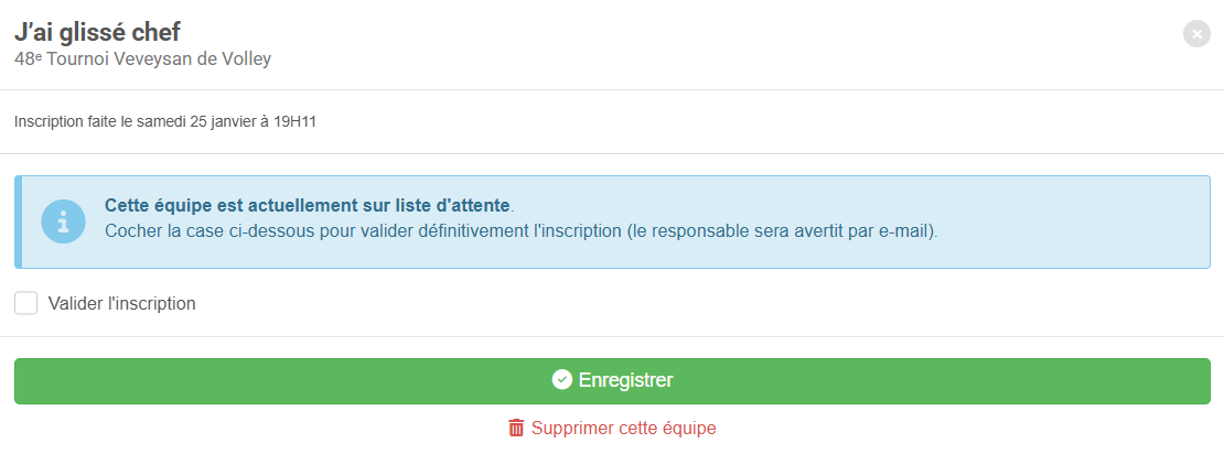 Statut disponible lors de la validation de la participation d'une équipe à un tournoi