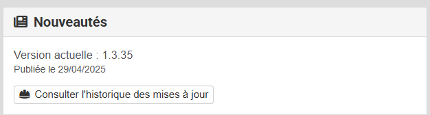 Le jour où l'historique des mises à jour de l'App mobile sera disponible dans l'Application internet, le bouton Consulter l'historique renverra sur cette page, soit depuis la console d'administration de l'App mobile de l'application internet, soit depuis la bas de la page Menu de l'App mobile.