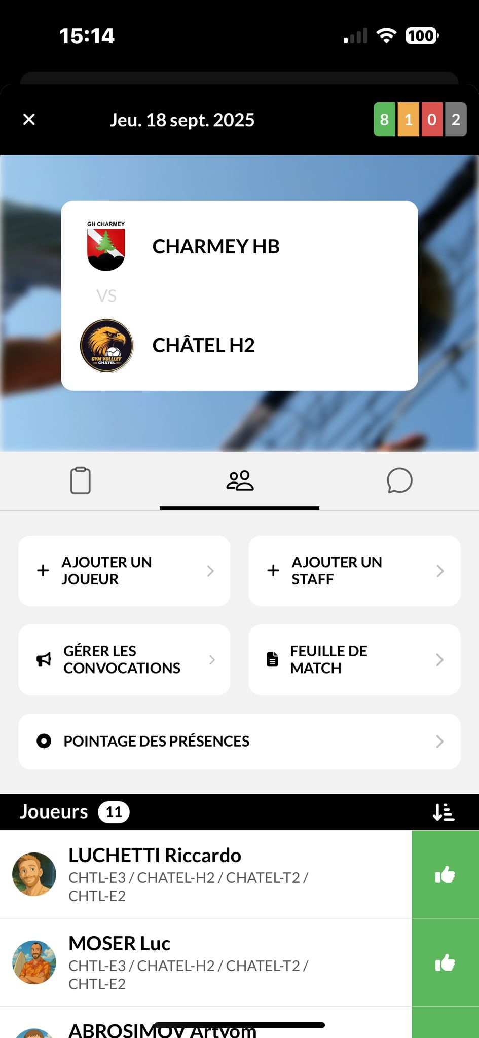 Le bouton pourrait se situer avec les autres boutons déjà disponibles et proposés fonction des droits de l'utilisateur, au-dessus de la liste des joueurs convoqués.