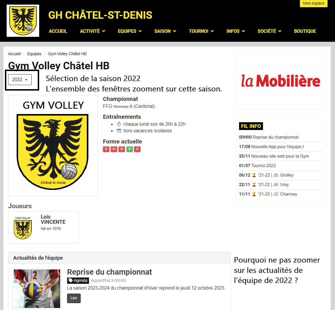 Zoom sur les actualités de l'équipe uniquement pour la saison sélectionnée