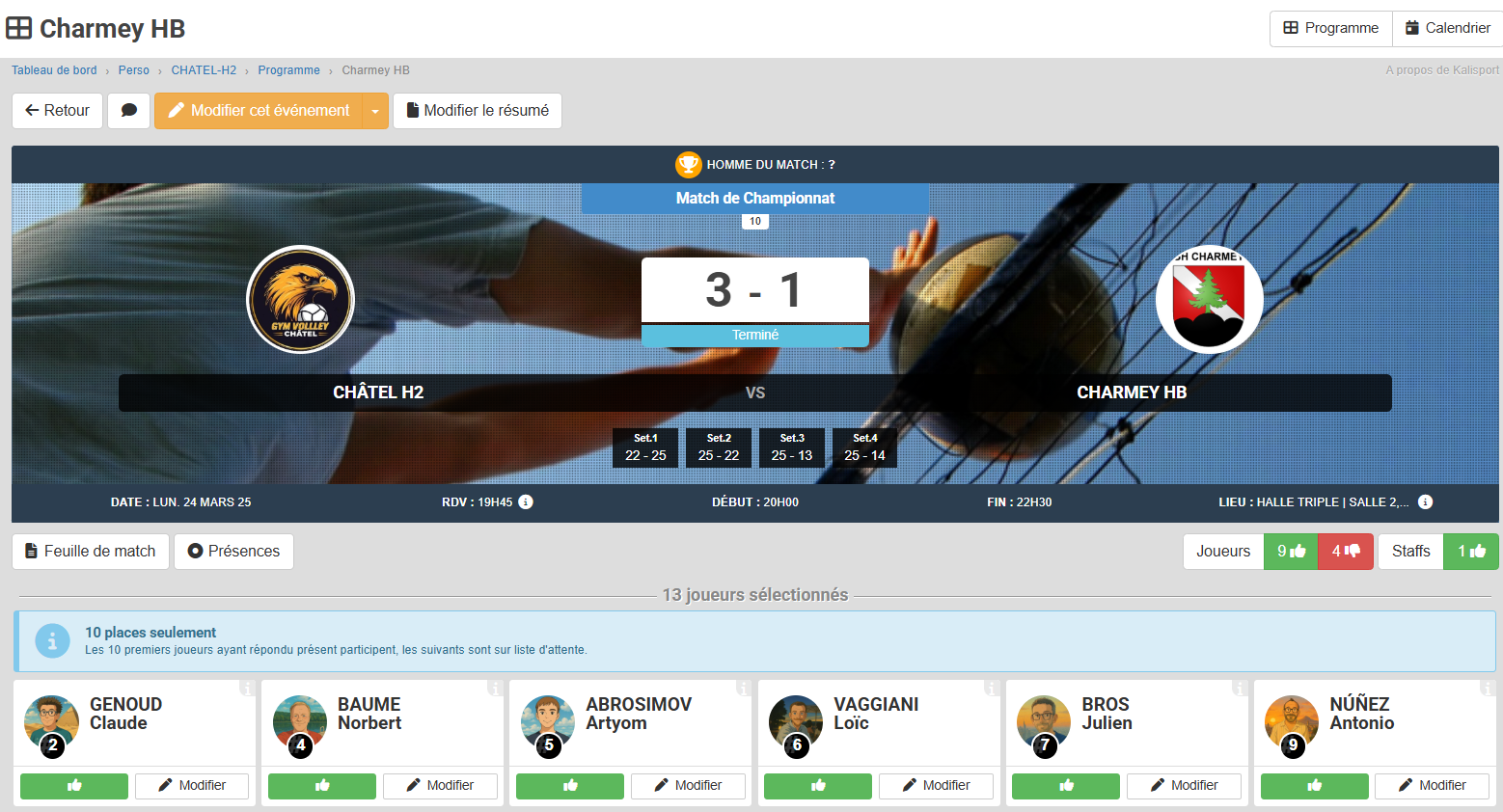- Pouvoir confirmer ou modifier dans la Feuille de match le poste prévu avant un match pour un joueur
