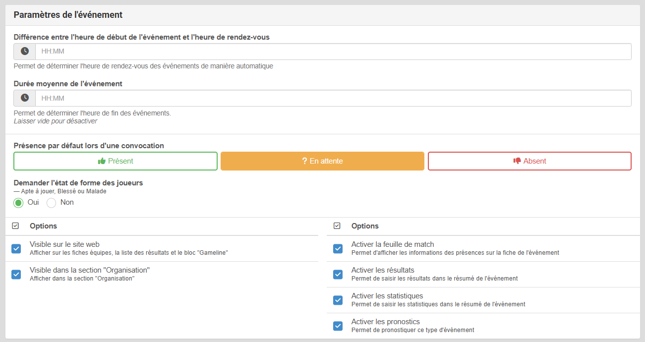- Tableau de bord Options Sport Événements d'équipes - Types - Paramètres par défaut d'un événement