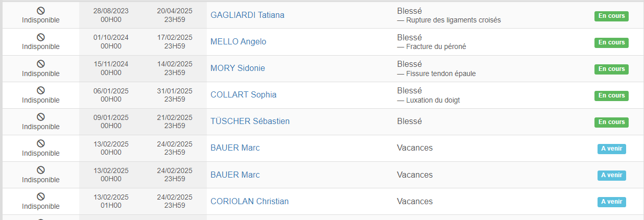 Dans la copie d'écran suivante, Tatiana, Sébastien, Marc et Christian sont toustes indispos le 21 février 2025.