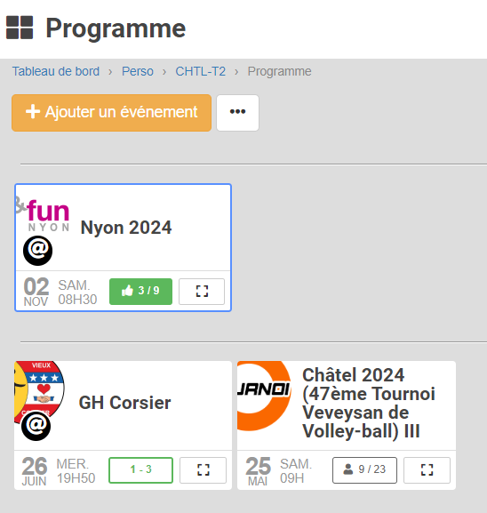 Une possibilité pourrait être d'utiliser l'une des deux façons d'accéder à la page Equipe d'un évènement, à savoir le clic sur le nom de l'évènement ou le clic sur le carré à droite de rectangle de synthèse de la participation de l'équipe.
