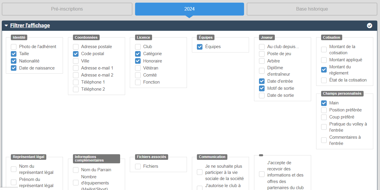 Mise à disposition de la même zone "Filtrer l'affichage" que sur la page des Adhérents (champs et utilisation)