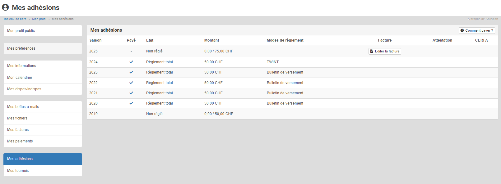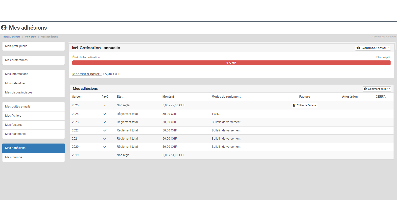 - sous forme d'un nouveau bouton dans la page d'accueil de l'App mobile (comme celui des licences ou des pronostics par exemple) et qui renverrait sur la page de l'application internet Mon Profil/Mes adhésions (https://.../private/profil/adhesions), page qui intégrerait le bloc "Cotisation* en tête de page puis le tableau actuel à la suite.
